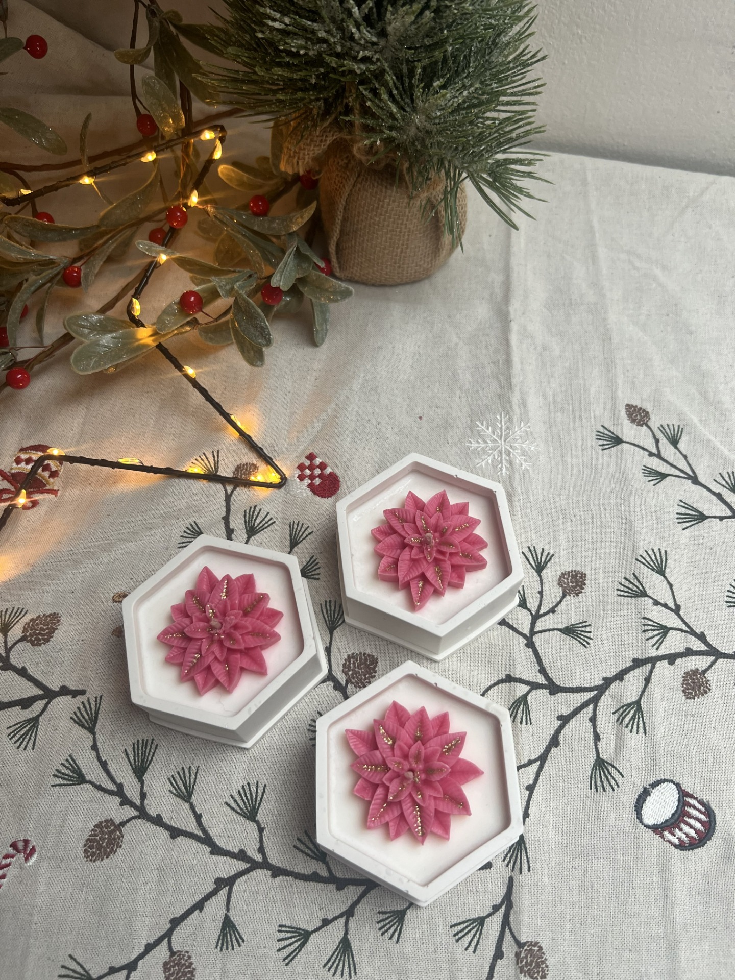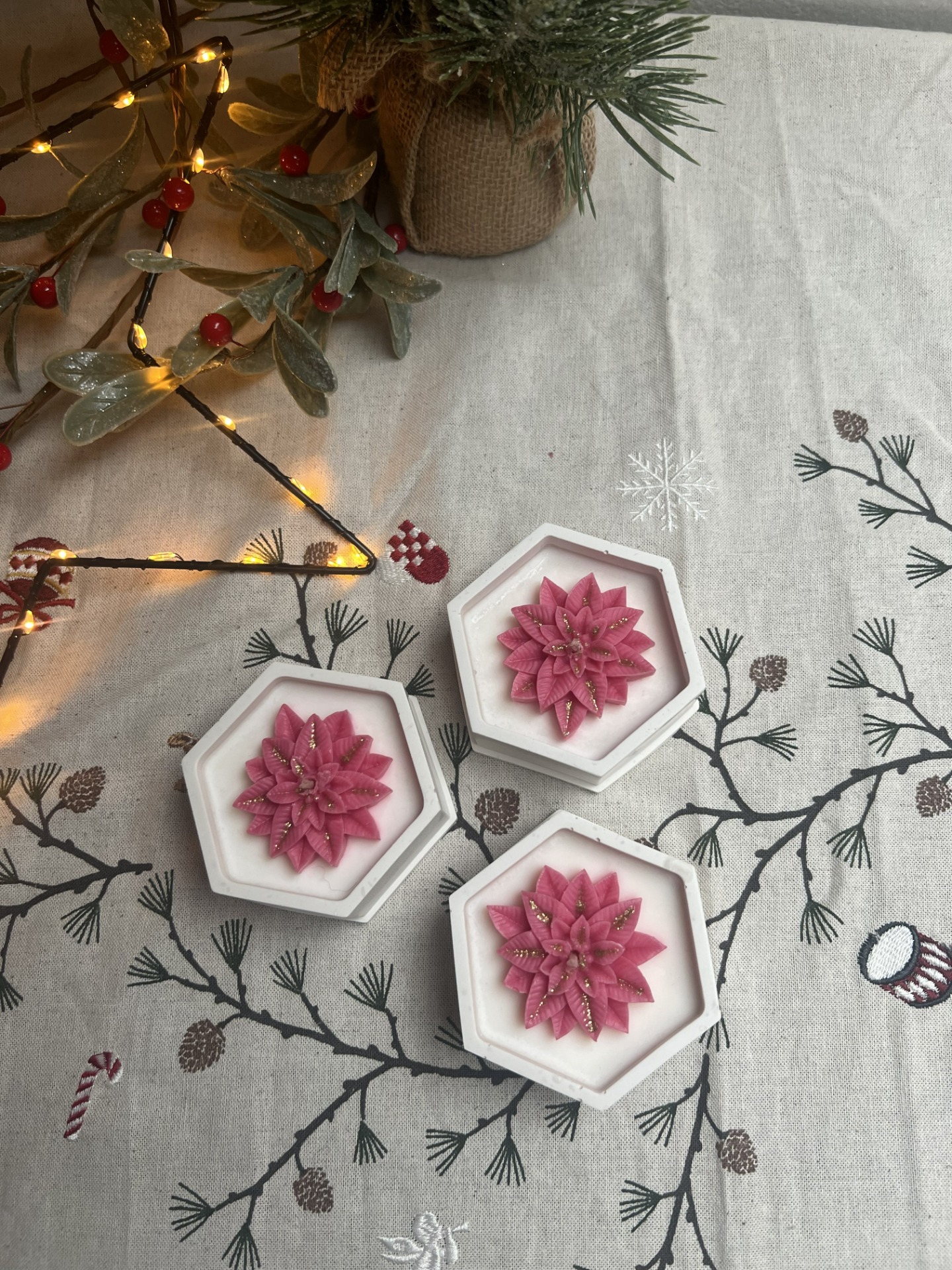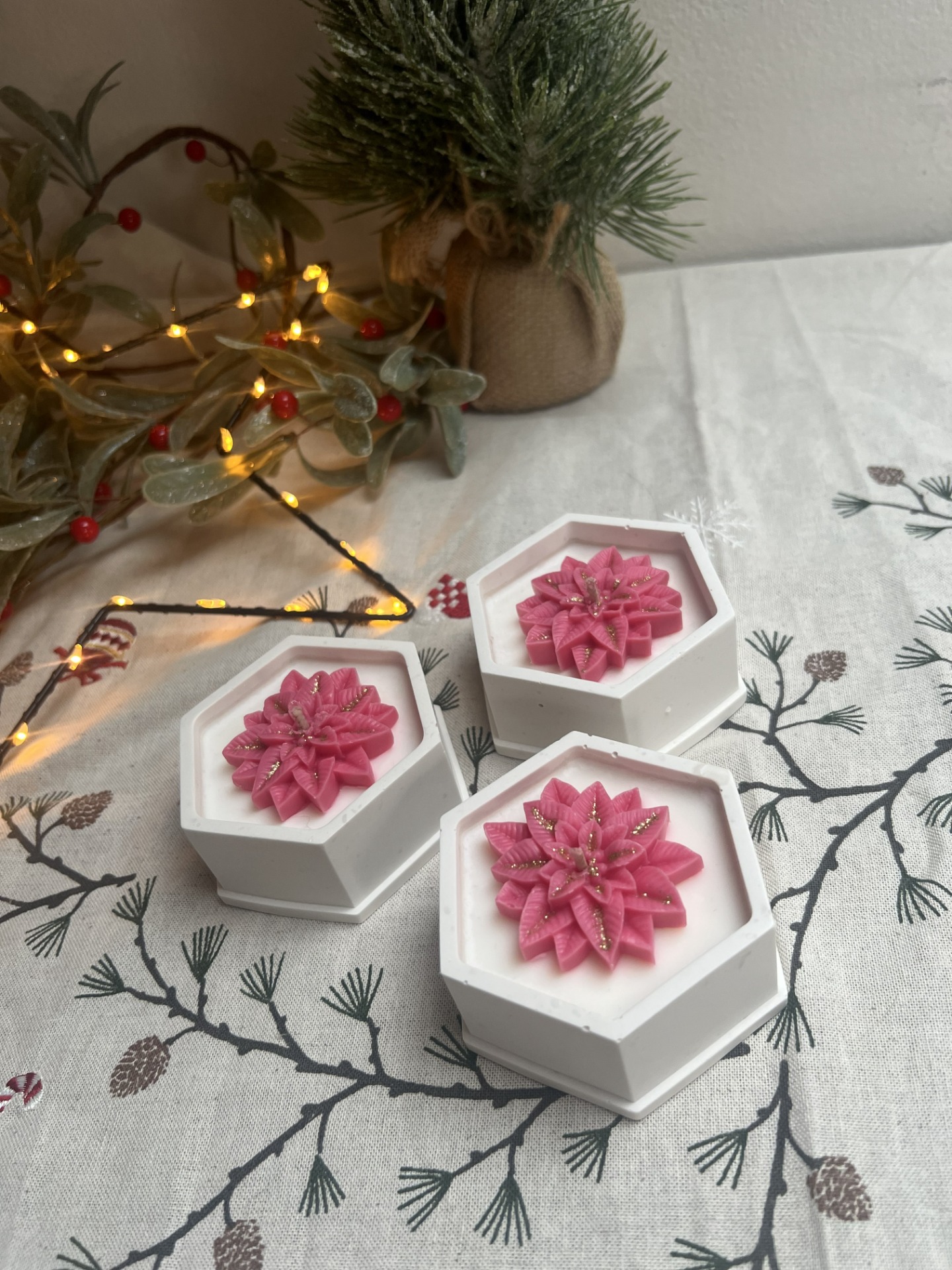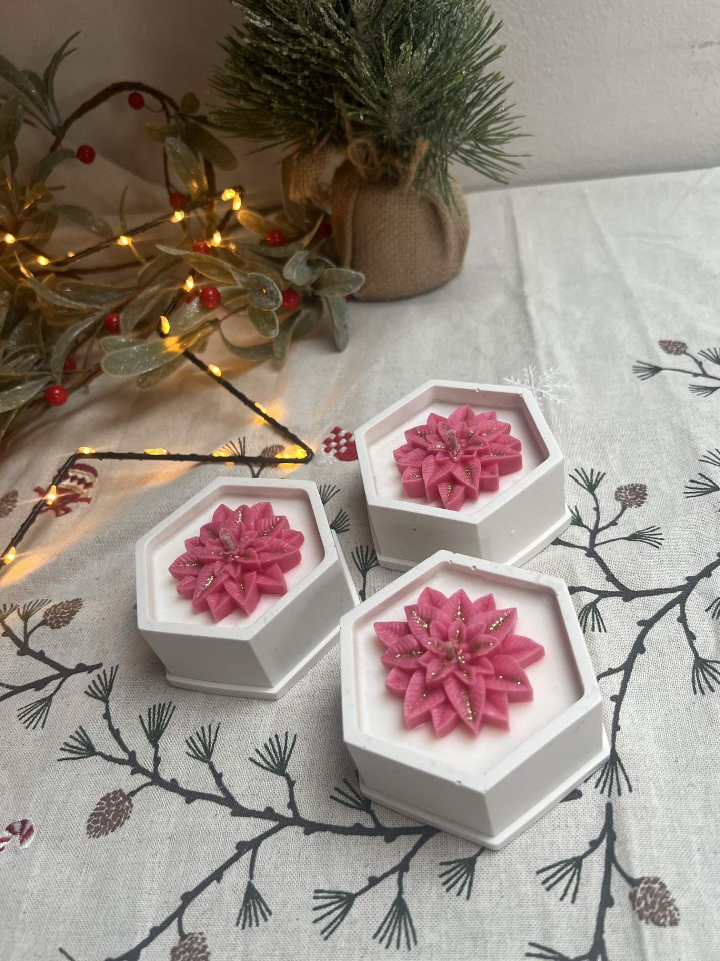 Každá svíčka je odlita do ručně vyrobené nádoby z jesmonitu a zdobená vánoční hvězdou, které jsou ručně lité a dělají z každého kousku jedinečný originál. Nádobu můžete po vyhoření využít znovu, třeba jako stylovou dekoraci, nebo květináč na sukulent.
