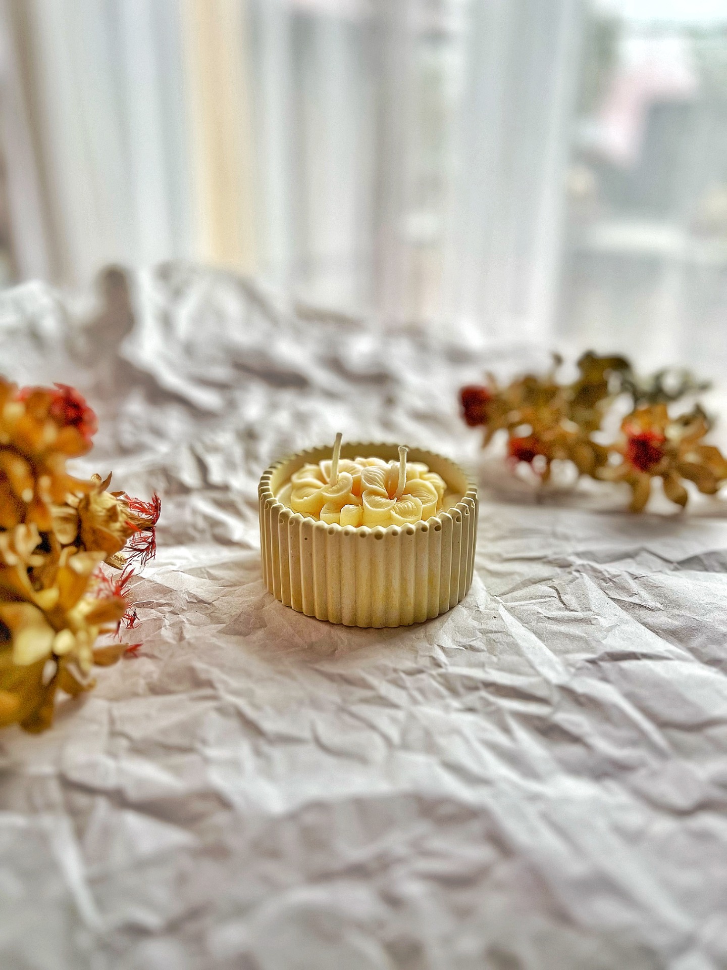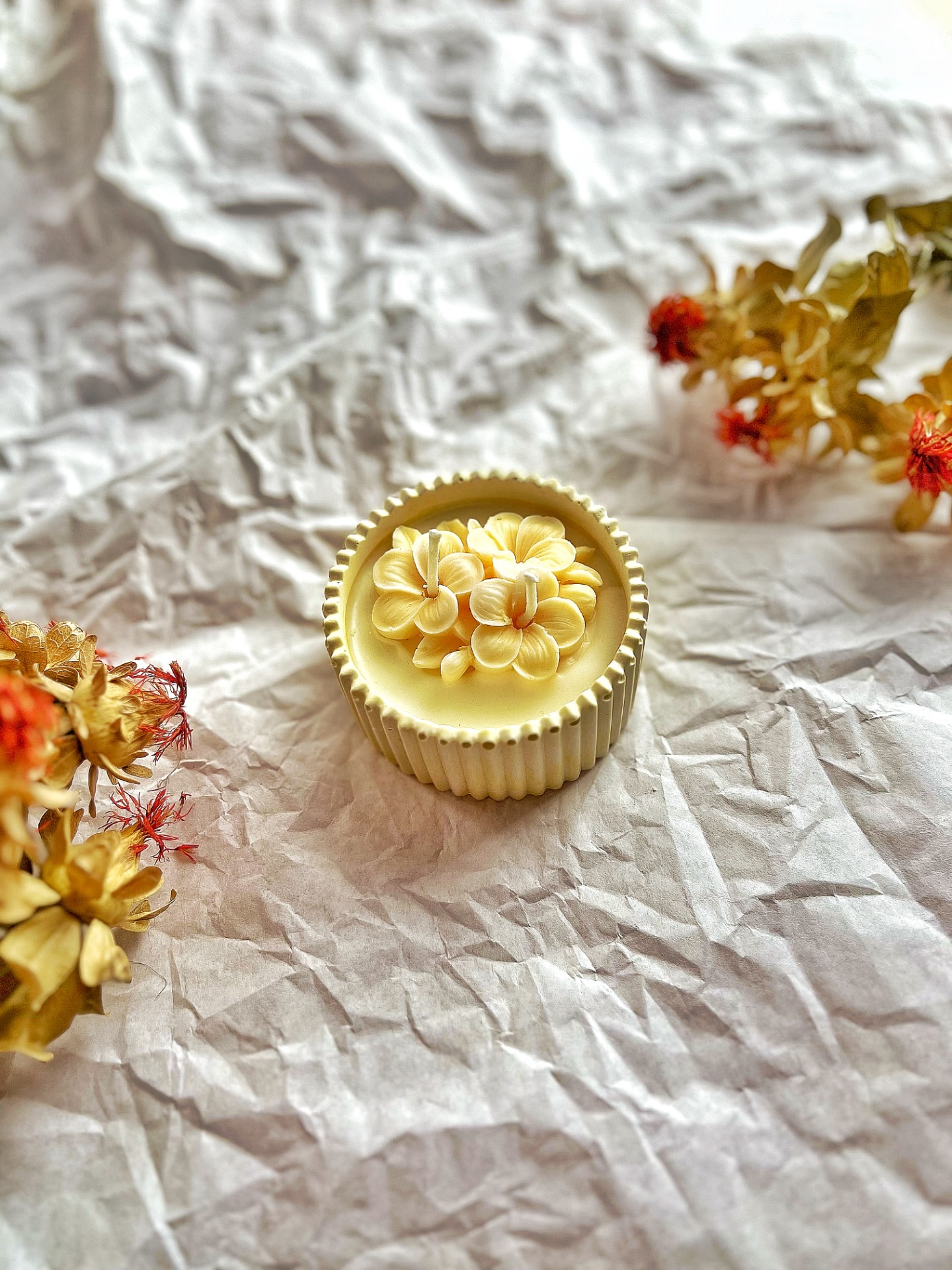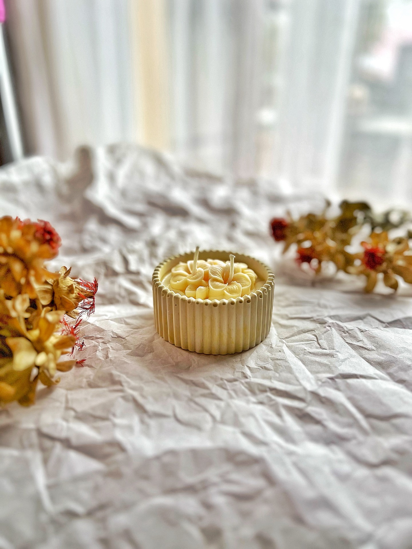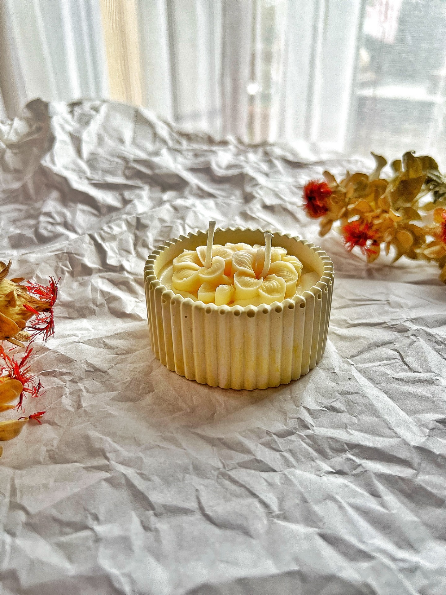 Vonná ozdoba (Moře a vyplavené dřevo): Ručně modelovaný květ na povrchu svíčky nese vůni slaného oceánu, borovice a santalového dřeva. Jakmile svíčku zapálíte, květ se začne pomalu rozpouštět a dodá čisté bavlně nečekanou hloubku a svěží, přírodní podtón.