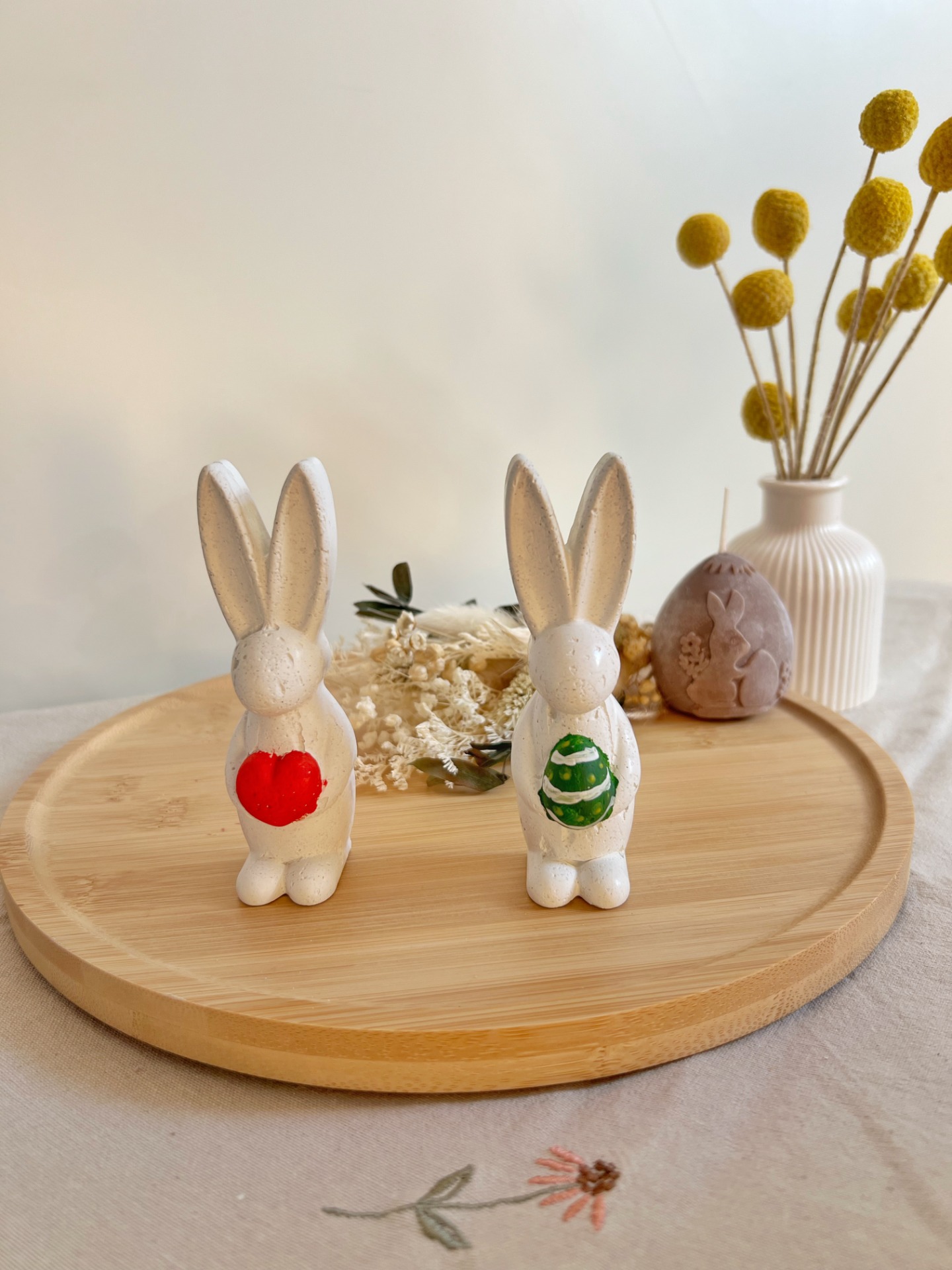 Betonoví zajíčci držící vajíčko nebo srdíčko jsou něžnou velikonoční dekorací, která vnese do domova hravou i sváteční atmosféru. Jemné barevné detaily krásně oživí minimalistický interiér a snadno je sladíte s dalšími jarními dekoracemi, květinami i svíčkami.