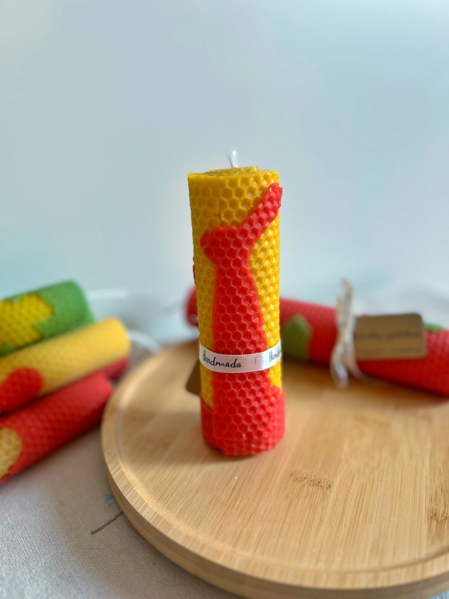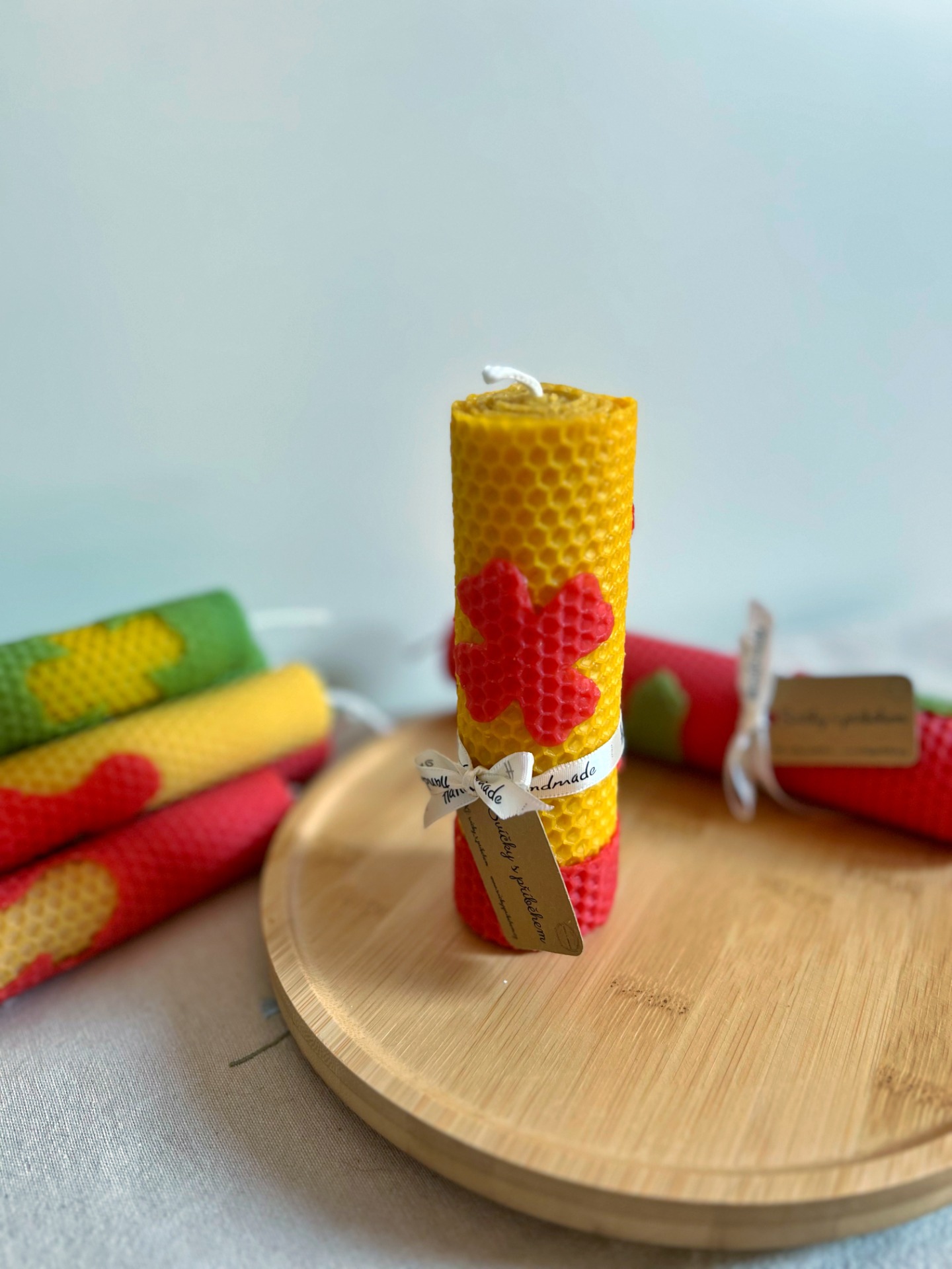 Ručně motané svíčky z mezistěn z včelího vosku, zdobené jemnými srdíčky.