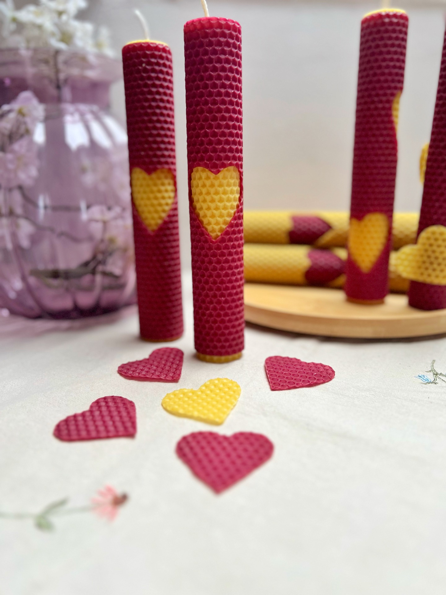 Ručně motané svíčky z mezistěn z včelího vosku, zdobené jemnými srdíčky.