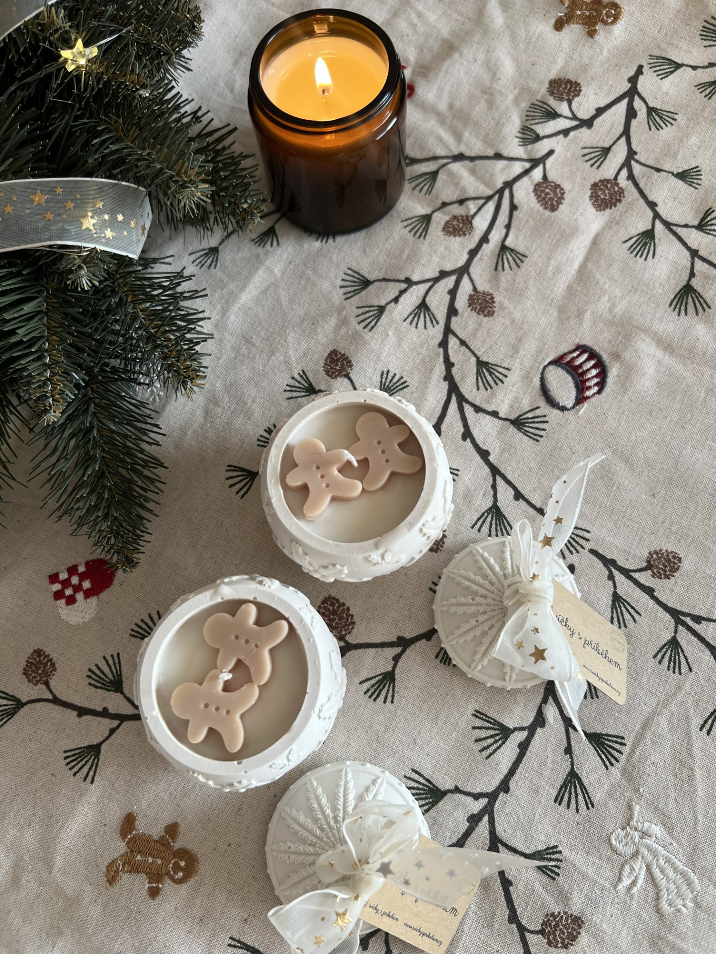 Každá svíčka je odlita do ručně vyrobené nádoby z jesmonitu a zdobená Panem perníčkem, které jsou ručně lité a dělají z každého kousku jedinečný originál. Nádobu můžete po vyhoření využít znovu, třeba jako stylovou dekoraci, nebo květináč na sukulent.