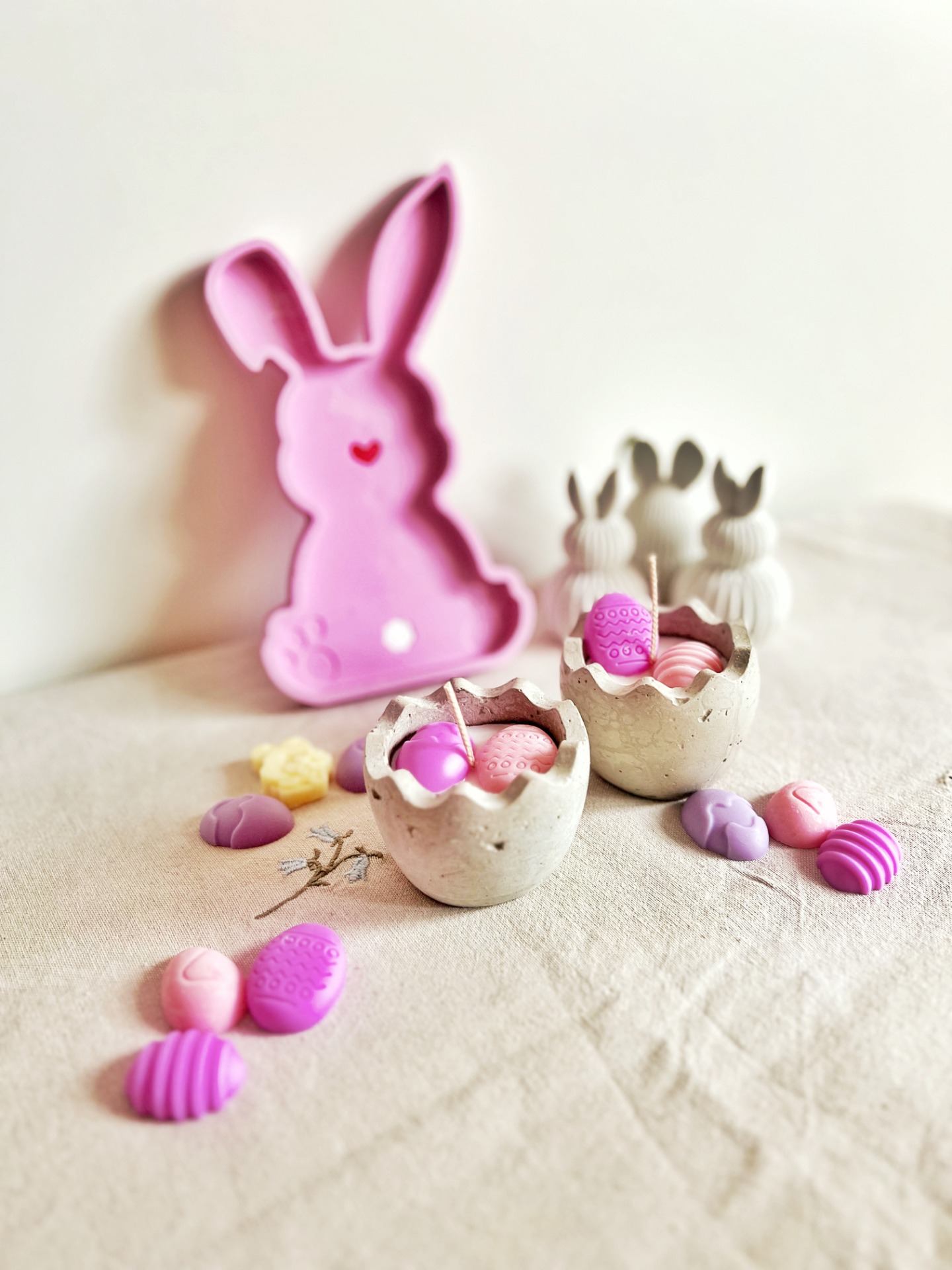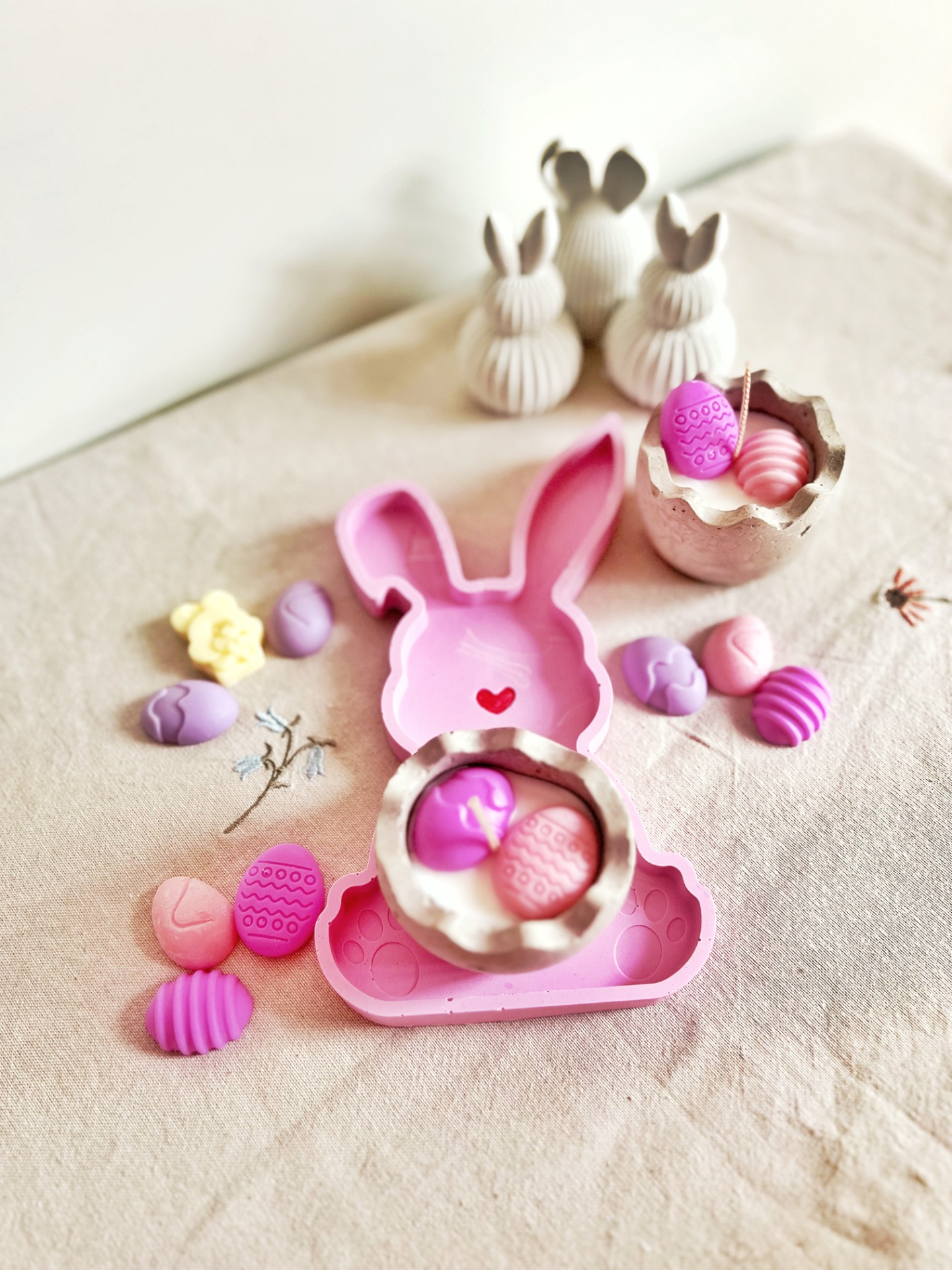 Svíčka v ručně vyráběné betonové misce ve tvaru vajíčka.