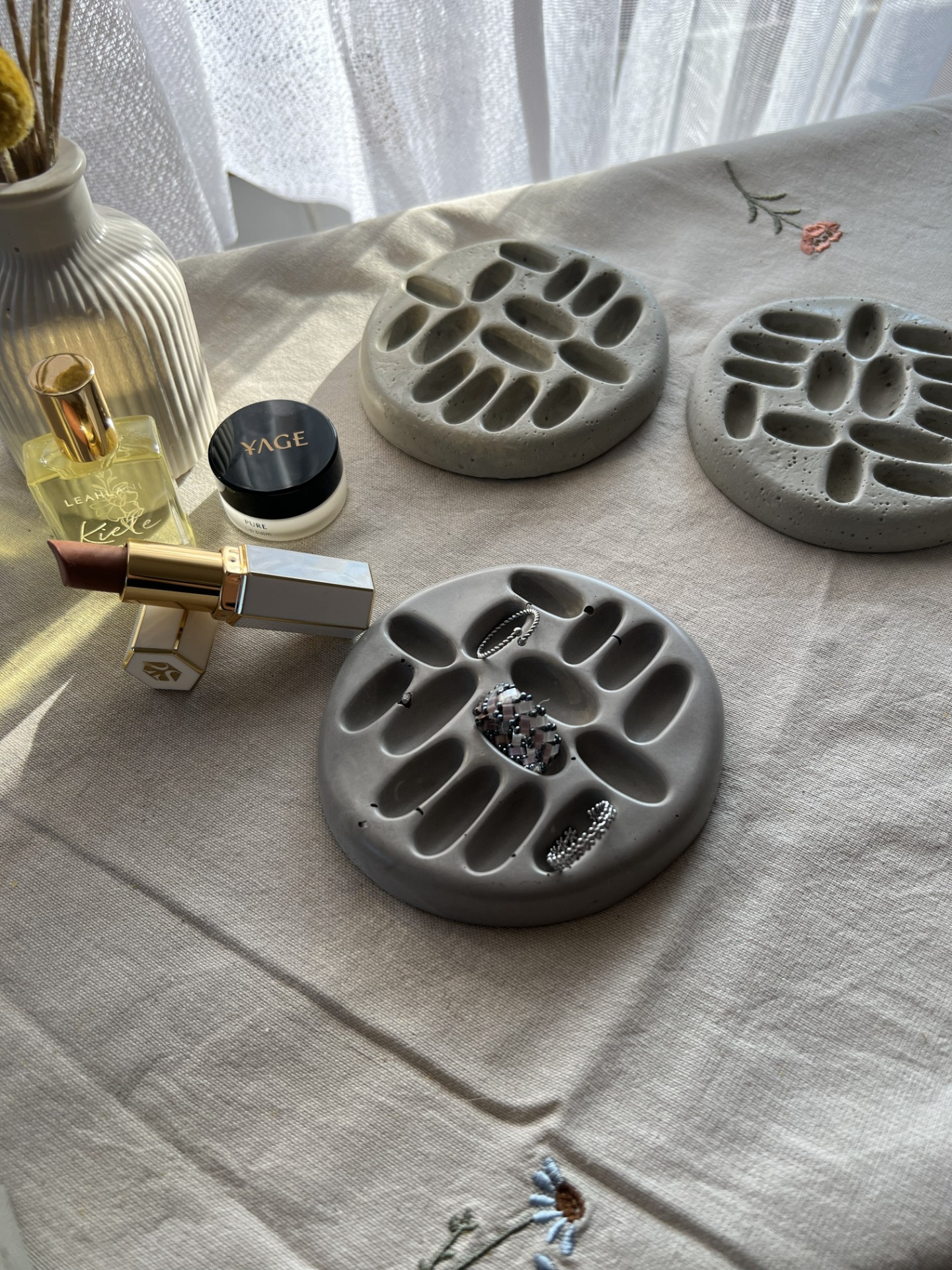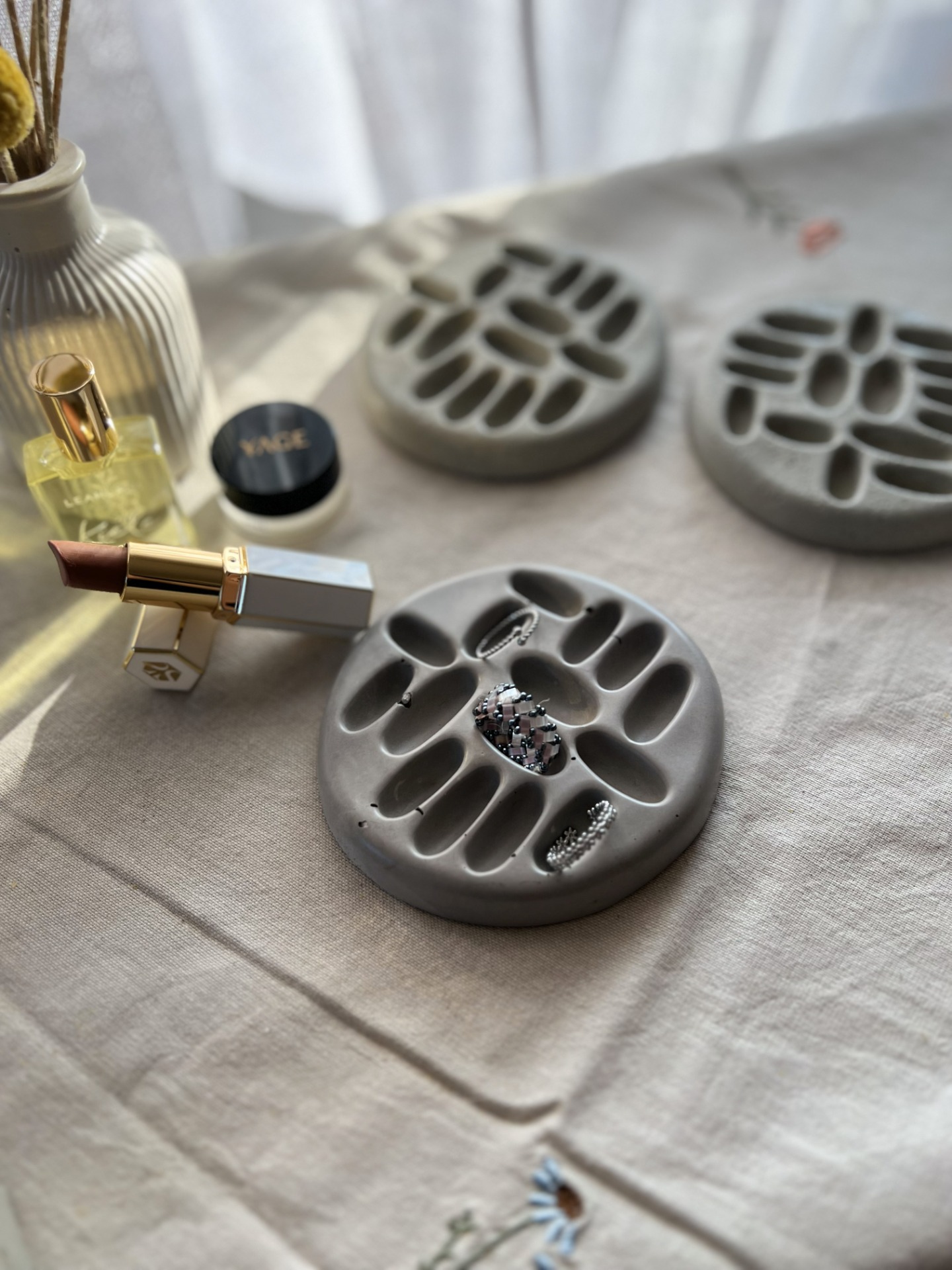 Ručně vyráběný tácek z ekologické alternativy betonu, navržený pro odkládání prstýnků a drobných šperků.